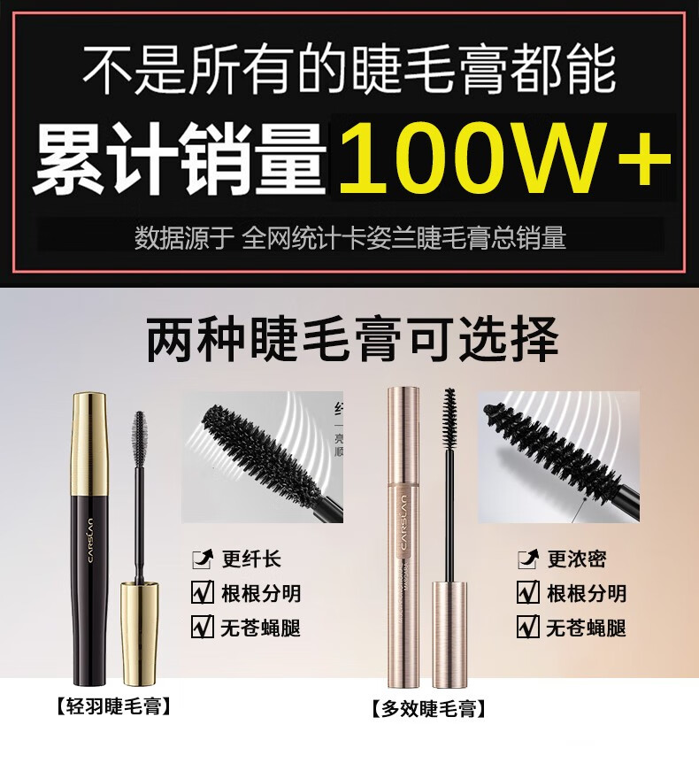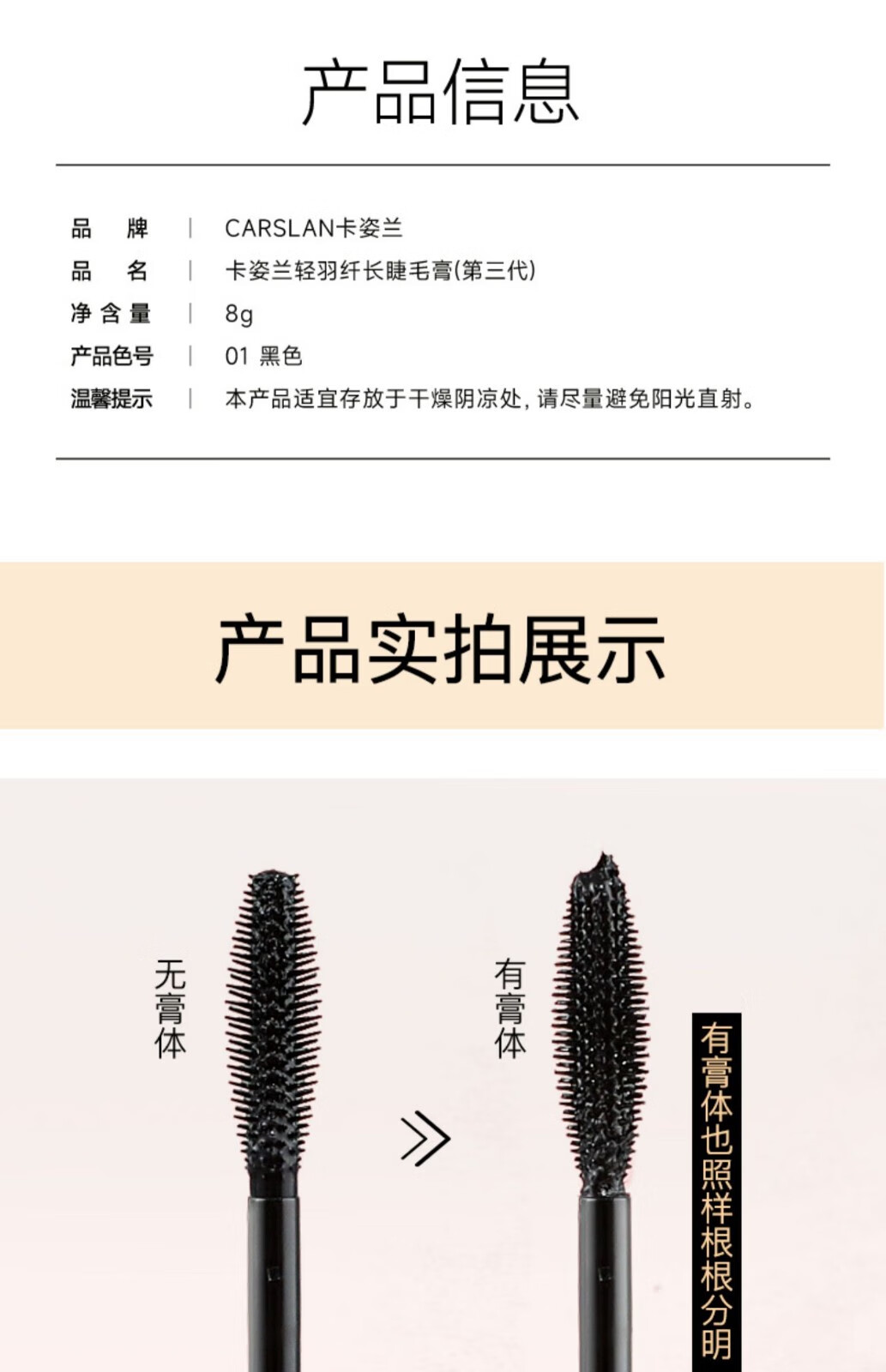 卡姿兰(Carslan)大眼睛睫毛膏防水不晕染拉长纤长浓密卷翘不脱妆无苍蝇腿根根分明 轻羽睫毛膏8g(更纤长)